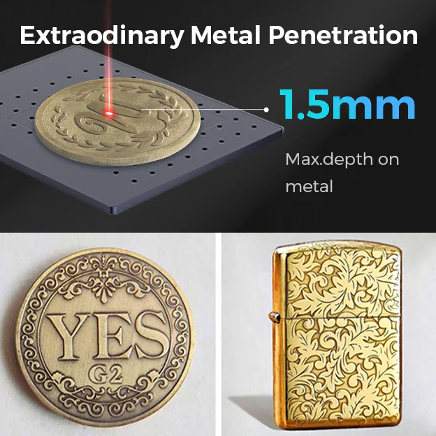 Increased energy speeds up the removal of cloth. For deeply engraving metal, using a lower frequency raises the top energy. For instance, first-class element engraving requires 30 to 50W, medium-strength tasks require 100W, and commercial mold deep engraving requires 200W.
